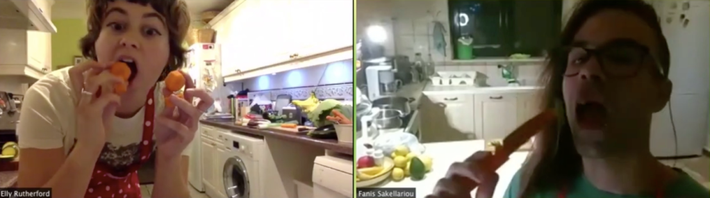 Two isolated individuals burst into kitchenware warfare whilst dancing a polka with vegetables. A comedic, semi-improvised performance in collaboration with Fanis Sakellariou, live from kitchens in Kent and Athens. Performed online at Domestic presented by Word of Warning (October 2020) and MISC: MA Performance Design & Practice Live Works (August 2020).